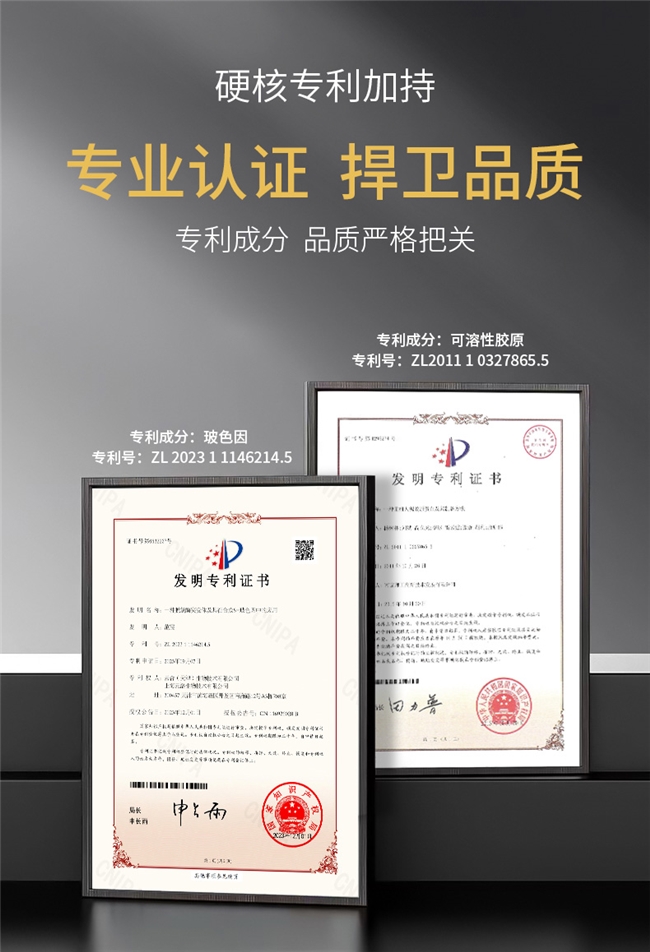 2、专利成分(可溶性胶原):中国发明专利号:ZL 201110327865.5,是肌肤本身就含有的营养成分,能快速补充肌肤流失的胶原蛋白,不用额外费力,就能有助于提升肌肤紧致度,改善肌肤松弛、脸垮的状态,坚持使用可让肌肤变得饱满弹润、QQ弹弹;和玻色因协同作用,形成“抗老+修护”双重防护,让抗老效果更稳定、更持久,不用怕细纹反复出现。