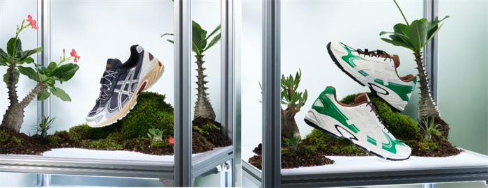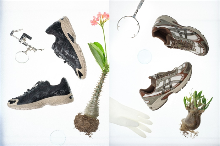其中,灰蓝配色以“棒锤树属”为蓝图,融合花朵的红色点缀鞋身;黑棕配色自园丁黑色的围裙汲取灵感,直面匠心所在;白绿配色将“白肌”的绿色叶片与枝干的棕白写意呈现;棕红配色则来自于UV灯下块茎植物所呈现温暖色彩。此外,全系列鞋后跟立体压印设计皆融入了块茎植物“龟甲龙”的茎干龟裂纹理,再添旷野线索。