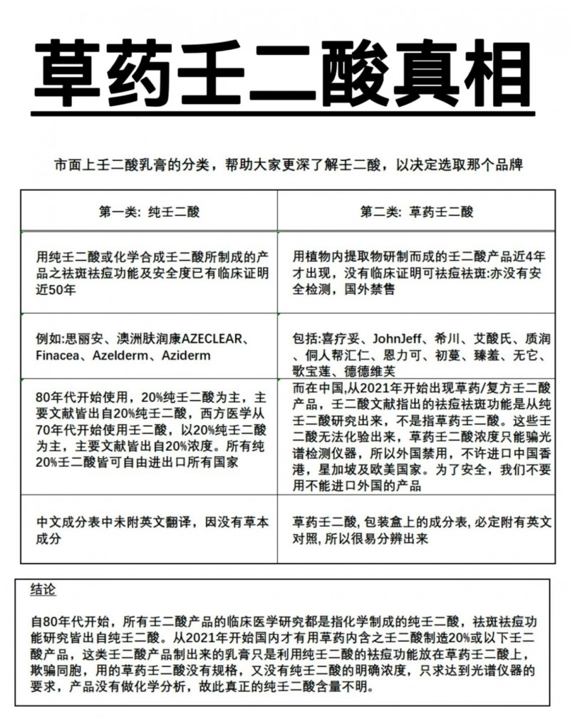 近期多人在谈论壬二酸的真假,市面上充斥着冒充纯壬二酸产品的草药壬二酸, 這類「假壬二酸」产品是从植物中提取草药壬二酸而造成,而草药壬二酸因没有临床验证证明能祛痘祛斑,在国外禁售的,只要你比较一下真壬二酸产品同草药壬二酸的成分便知道。